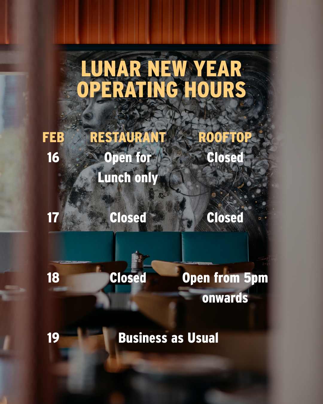 Ala carte dining at the restaurant will still be available on 16 Feb, and the rooftop bar reopens on 18 Feb from 5pm for your evening fix. Business resumes as usual from 19 Feb onwards.